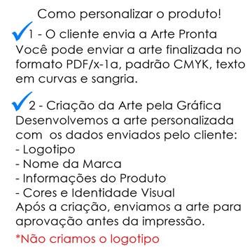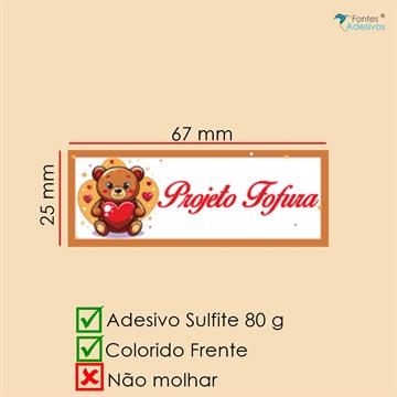 A etiqueta possui 25 mm de altura por 67 mm de largura, feita em papel sulfite colorido frente. Não deve ser molhada para preservar a qualidade do adesivo e da impressão. Design com espaço para escrita do nome ou outra identificação.